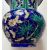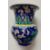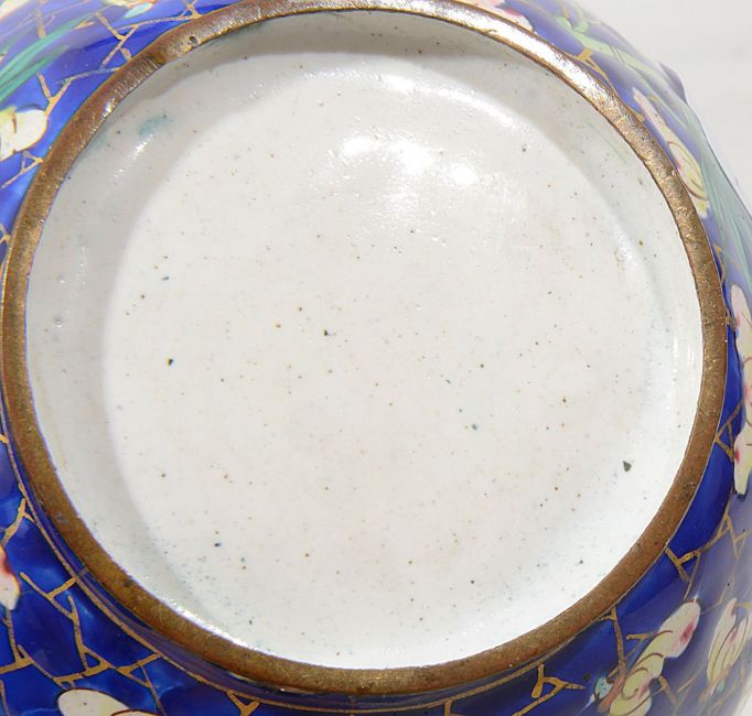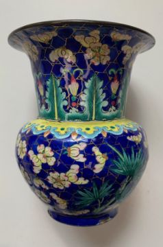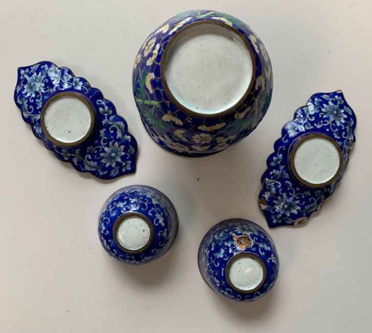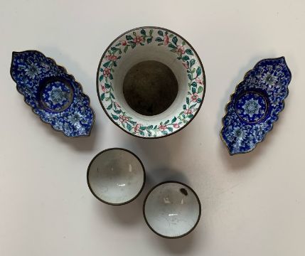 A Chinese Canton enamelled metal miniature zhadou,19th century, with flared neck, decorated with flower and bamboo over cracked ice pattern against a blue coloured ground, together with a pair of Chinese Canton enamelled metal rice wine cups and saucers, decorated with repeating floral and scrolling leaf motif against a cobalt blue ground, heightened with gilt, the saucers of ellipse form with shaped edge, (5)zhadou height 10.4cm Condition: All pieces with crazing and some losses to enamel - Both bowls with losses and crazing - one bowl with loss to interior and exterior. Zhadou with losses and chips to lower edge, crazing to interior.