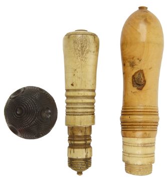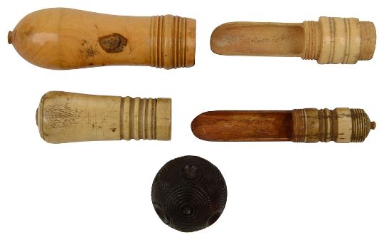 one boxwood and bone, the other bone, the puzzle ball with a push out lidded compartment, (4)