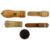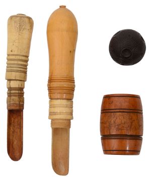 Two early 19th century turned pocket apple corers, a boxwood barrel form pot with screw fitting lid and a small ebony puzzle ball