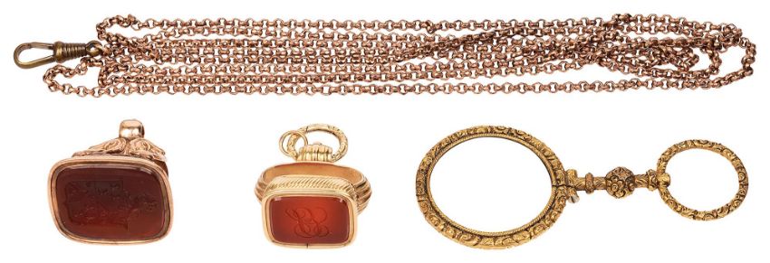 with crest, together with a Victorian gold and carnelian fob with intertwined initials, and a late Georgian gilt metal quizzer on a gold plated guard chain (3)