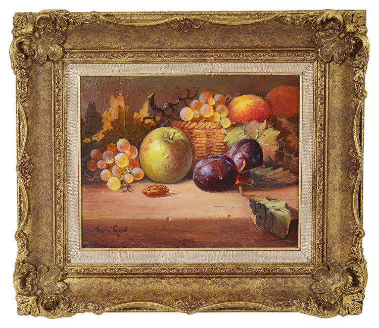 'Still Life with Basket of White Grapes, Apples and Plums', oil on board, signed lower left, framed, frame labelled verso,