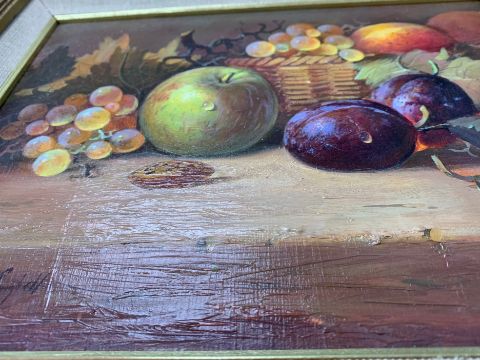 Condition: Good overall condition - some thickness/ possible overpainting to oil on grape vine, two vertical panel lines visible.