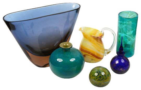 A collection of six pieces of Murano and Mdina type art glass,including: a large Murano Sommerso type vase, of flared form, in blue and amber colour; a signed Mdina glass vase, blue green colour of globular form; a cylindrical signed Mdina vase; a signed Mdina fish type paperweight; an art glass jug, in yellow brown coloured glass and a blue aventurine glass scent bottle, (6)the first height 24cm Condition: Overall condition good - some pieces with flaws visible. The larger Murano vase measures height 24cm, width 32.5cm, depth 11cm. In good condition overall and with some scratches to its base, as you would expect. See images.