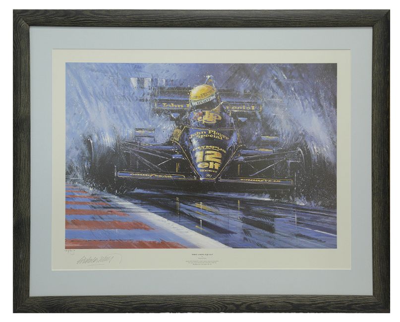 Formula One : A limited edition print by Nicholas Watt 'First Among Equals', depicting Ayrton Senna's first race victory, signed and numbered 173/850, framed and mounted,