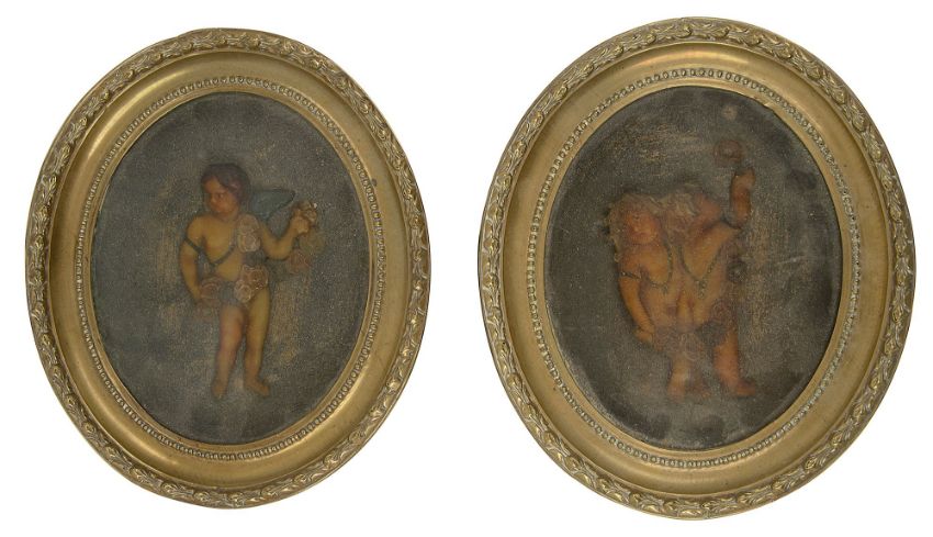 A pair of early 19th century oval wax relief pictures of putti with garlands