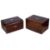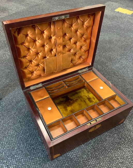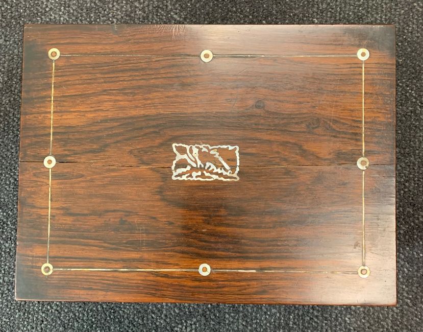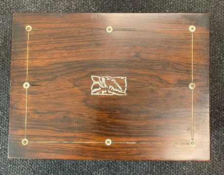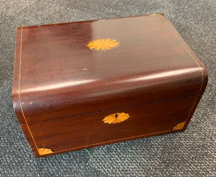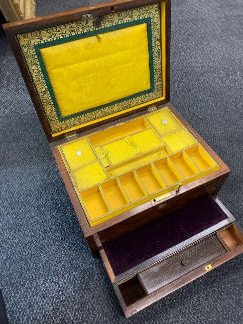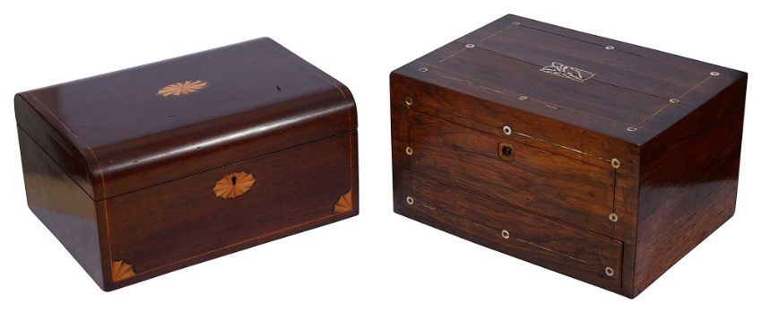 Two late 19th/ early 20th century sewing boxes, the first of rectangular form, in rosewood, inlaid with mother of pearl, central lid inlaid with leaf and bird motif, enclosing yellow fitted compartmental tray, interior and lower drawer with writing slope; the second of mahogany with satinwood fan inlay, domed lid, opening to reveal fitted tray, quilted silk button underside lid (2)the first width 30cm Condition: The first - Crack across entire top, lacking lock escutcheon, scratches and knocks throughout, some mother of pearl inlay lacking - interior with surface dirt. Fading visible to wood. The second - Knocks and scratches - lining possibly later