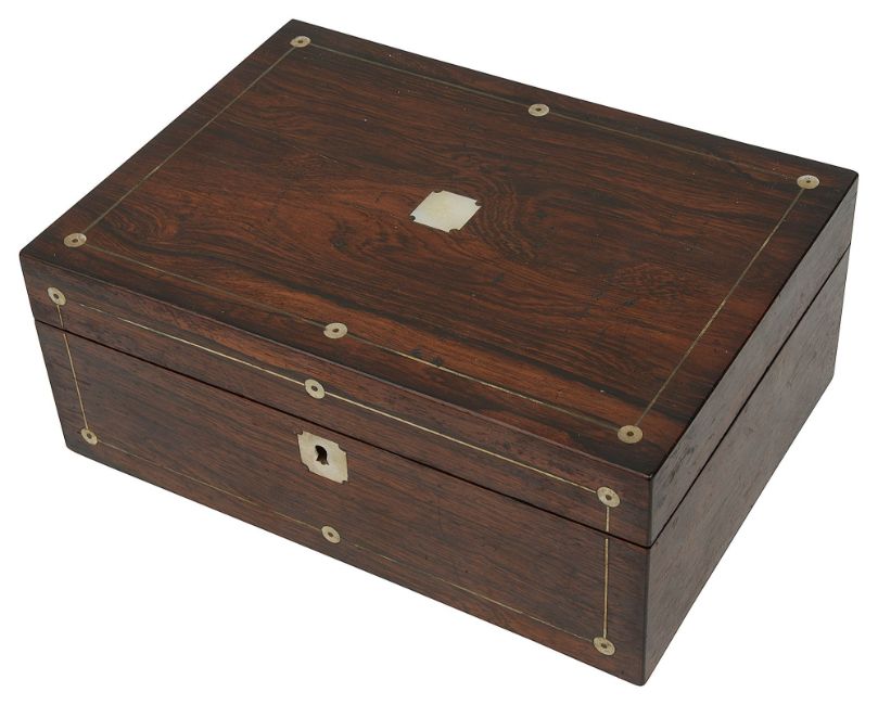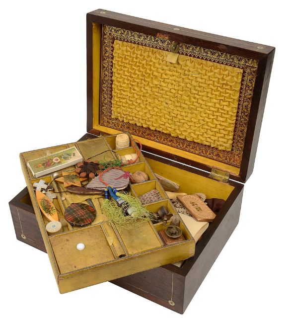 Condition: Box in fair condition. Some minor shrinkage splits to veneer on lid. Fair colour. No key. Contents in fair condition commensurate with age. Viewing recommended in person