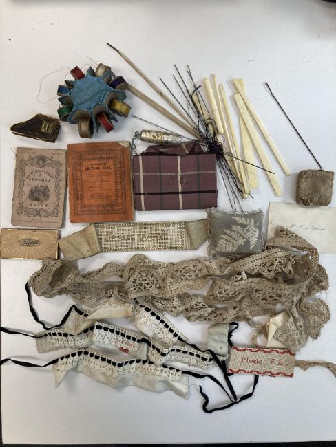 the box with yellow lined fitted interior with compartment to lid and and lift out fitted tray containing a novelty gilt brass coffee grinder tape measure, a walnut tape measure, two turned bone barrel shaped thimble cases, tartanware pin cushion and tatting shuttle, a Mauchline ware shuttle and cotton winder decorated with ferns, silver an other thimbles, two perforated card needlebooks and pincushions, both named dated 1833, a reel holder, lace etc., (qty)