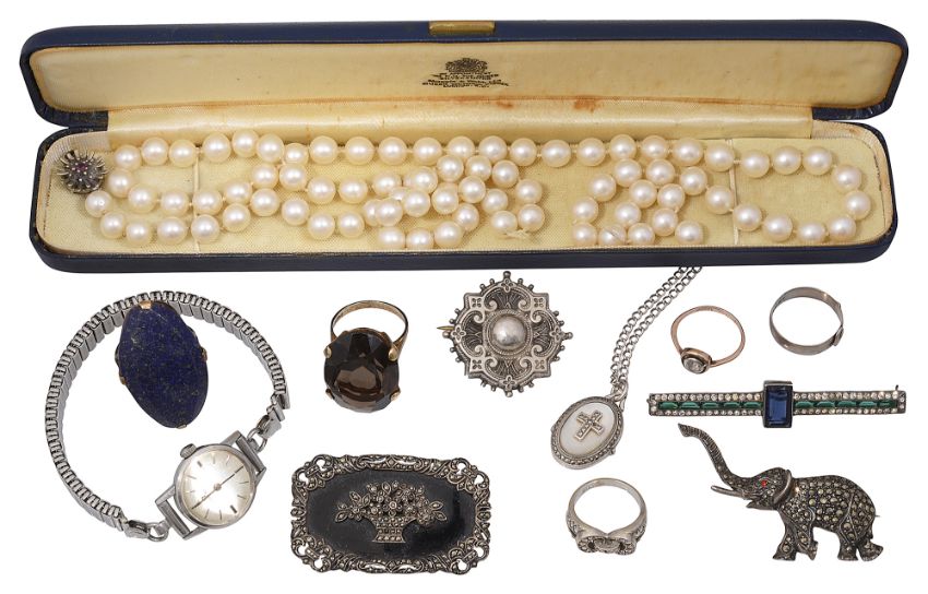 including a smoky quartz and 9ct yellow gold ring; a lapis lazuli ring; and a cultured pearl necklace to the ruby-set and 9ct white gold clasp (a/f),