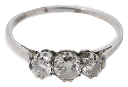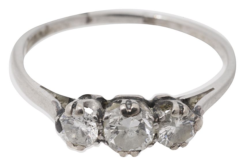 A three stone diamond ring,the graduated brilliant-cut diamonds coronet-set to the plain hoop stamped 'PLAT'ring size N, 2.4gCondition: Overall condition fair/good. Evidence of sizing in two places to lower shank. Claws possibly retipped. Total diamond spread weight approx 0.50cts, genrally SI clarity, I/J colour
