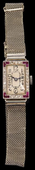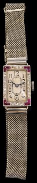 A lady's 18ct white gold and diamond-set cocktail wristwatch, the rectangular dial with Arabic numerals to the single-cut diamond-set bezel with calibré-cut ruby (untested but probably synthetic) corners, 16 jewelled movement, case Chester hallmark, to the mesh strap with deployant clasp stamped '9ct'