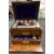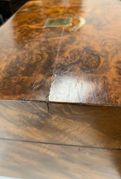 Condition: Split to top running from shield to left hand edge and continuing further split to left vertical, indentation and scratches to top, patched section to back corner, largest rectangular glass box cracked, interior silk with some perishing.