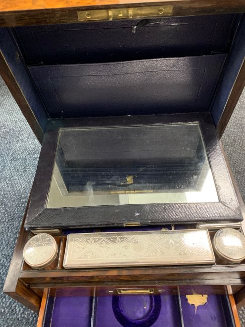 the domed lid inset with brass shield and banner cartouche, interior with velvet, leather and silk lining, stamped with makers name, containing a series of cut glass bottles and boxes with silver plated tops, mirror inset to underside of lid, drop down front inset with brass escutcheon opening to reveal two drawers, with recessed brass handles, with key,