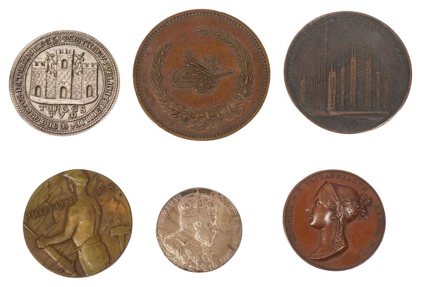 to include Victoria bronze coronation medal, 1838 by Pistrucci, a Joan Galeatius medal commemorating the construction of the spire of the Duomo di Milano, 1844, An Edward VIII silver coronation medal, an Italian .800 silver Sigillo Trecentesco del Comune di Trieste medallion, engraved verso H.M.S Coventry in Trieste 26.9.930-VIII Il Podesta d.d.d., an Ottoman medal etc., (6)
