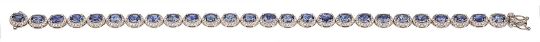 A sapphire and diamond-set line braceleteach of the 26 clusters centrally-set with an oval mixed-cut sapphire within a border of brilliant-cut diamonds to the concealed clasp with Sheffield hallmark for 18ct white goldlength 19.5cm, 15gCondition: Overall condition very good with little sign of wear. Sapphires: bright and well matched and an even cornflower blue.