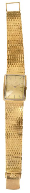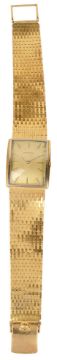 a rectangular dial with raised baton numerals, articulated gold bracelet, the case marked 18K 750
