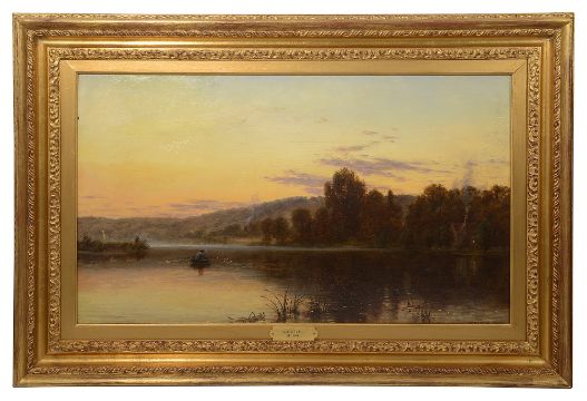 'Sunset over a Lake', oil on panel, signed lower right and dated 1864, framed,