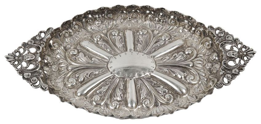 oval with with shaped sides and cast, lobed and foliate scroll repousse decoration, the pierced twin handles cast with maidens masks, palmettes and scrolls