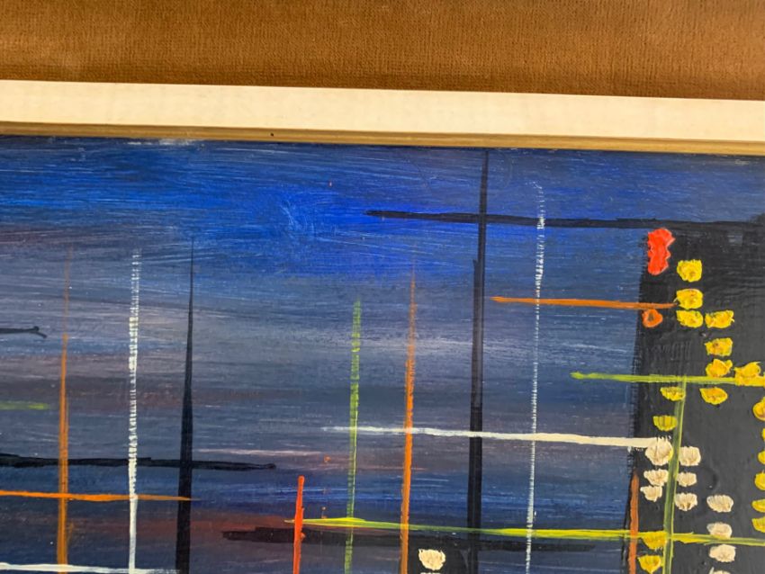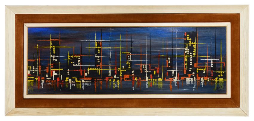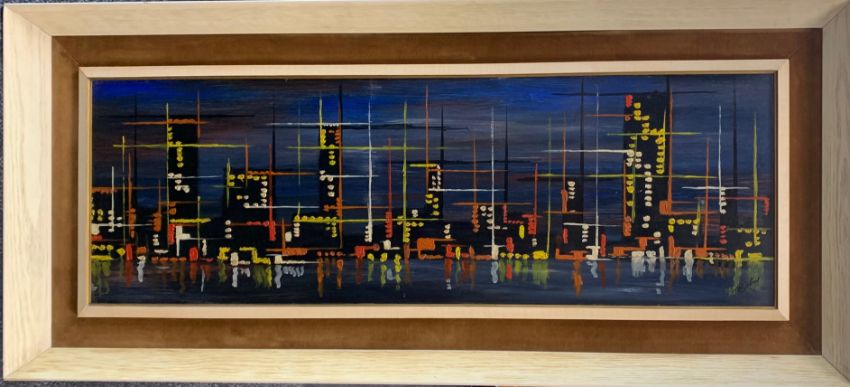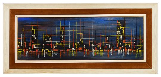 'Abstract Skyline', 1963, oil on board, signed and dated to lower right corner, framed,