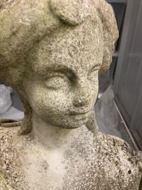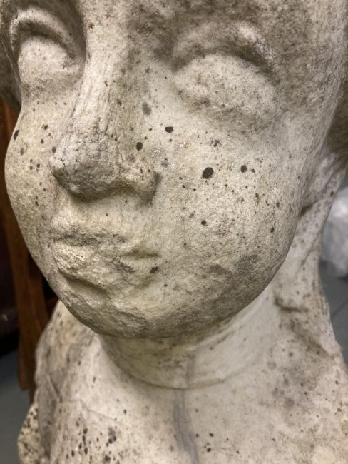 A weathered half length marble two faced allegorical bust of Prudence from the Cardinal Virtuespossibly 16th/17th Italian School carved to each side with a figure wearing a turban and dressed in flowing draperyheight 81 cm., width 72 cm., depth 45 cm.Condition: Weathered and in need of cleaning. Old chips / loss of detail to noses and chins and mouth. Stable crack to chest from right shoulder to base. The other side with a stable crack running through drapery to baseThis lot  will be removed to our offsite storage facility if not collected at the sale venue – Farleigh Golf Club, Warlingham 3pm by Friday 16th Please contact us for more information.From a Private Collection