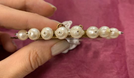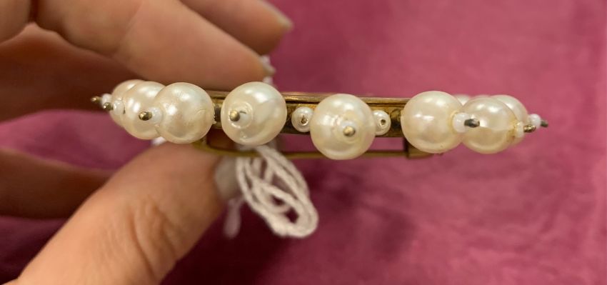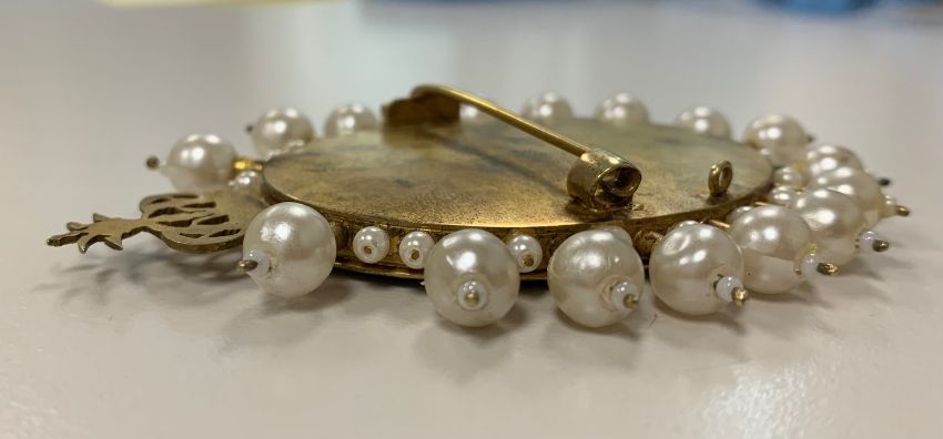 Condition: Small chip to card surface between 2-3 o'clock. brooch in good condtion. Some loss to finish of simulated pearls