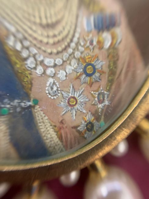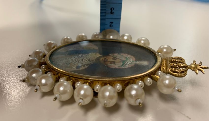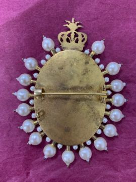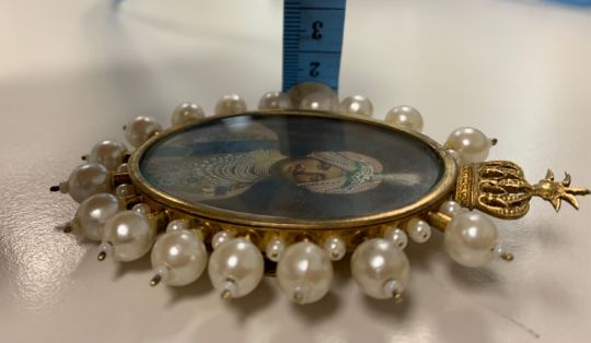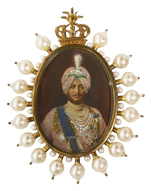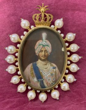 oval, watercolour on card, wearing medals, orders, sash, jewels and turban, glazed, brooch frame surmounted by a crown with simulated pearl surround