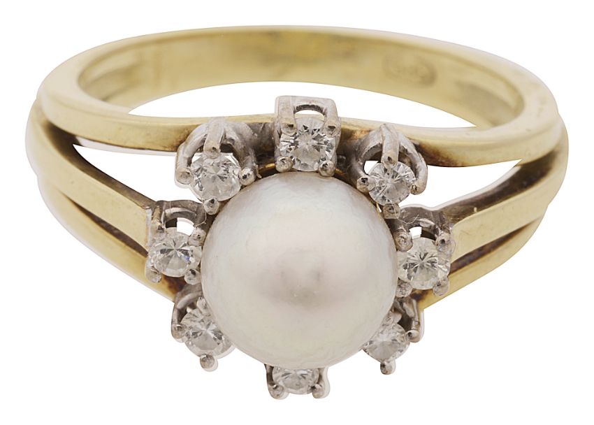 the central cultured pearl measuring 8.5mm in diameter to the surround of eight brilliant-cut diamonds, the trifurcated plain shank engraved '585'