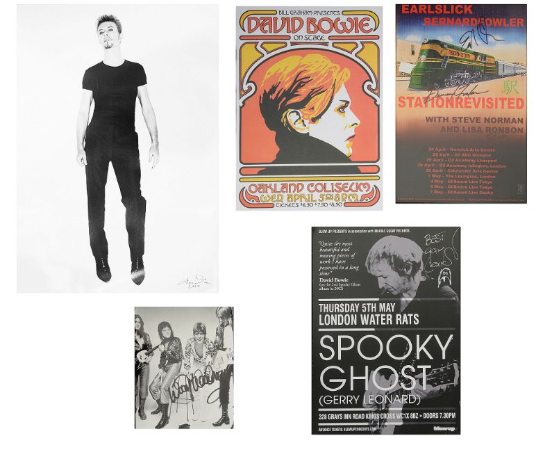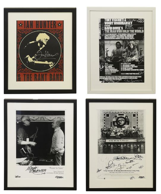 Music Memorabilia: A collection of signed pieces relating to David Bowie including; Tony Visconti and Woody Woodmansey 'Face to Face' signed limited edition photograph, signed by both in black felt pen, numbered 78/100; Tony Visconti and Woody Woddmansey multi signed poster, date 2014, signed in white ink; Tony Visconti and Woody Woodmansey's 'Holy Holy - The Man Who Sold The World Tour' multi signed poster; Ian Hunter & The Rant Band signed poster, all framed, together with Earl Slick and Bernard Fowler signed poster, additionally signed by Lisa Ronson, all in black felt pen; a modern colour lase reproduction David Bowie Bill Graham poster; Gerry Leonard signed poster, signed in white ink; a black and white image of David Bowie and The Spiders From Mars signed by Woody Woodmansey, in black felt pen, together with a large signed photographic image of David Bowie c. 1996, signed by the photographer to the lower right corner, (9)