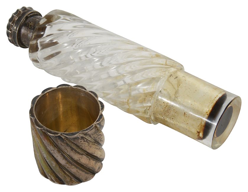 Condition: Good condition. interior in need of a clean. Cap open and closes well. Sight ding to cup base. Small fleabite to rim on shoulder of glass body