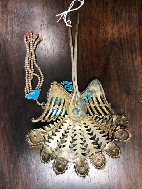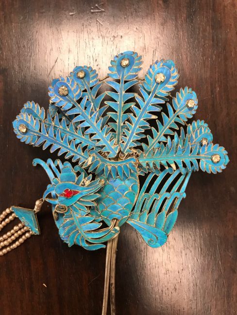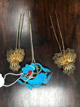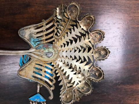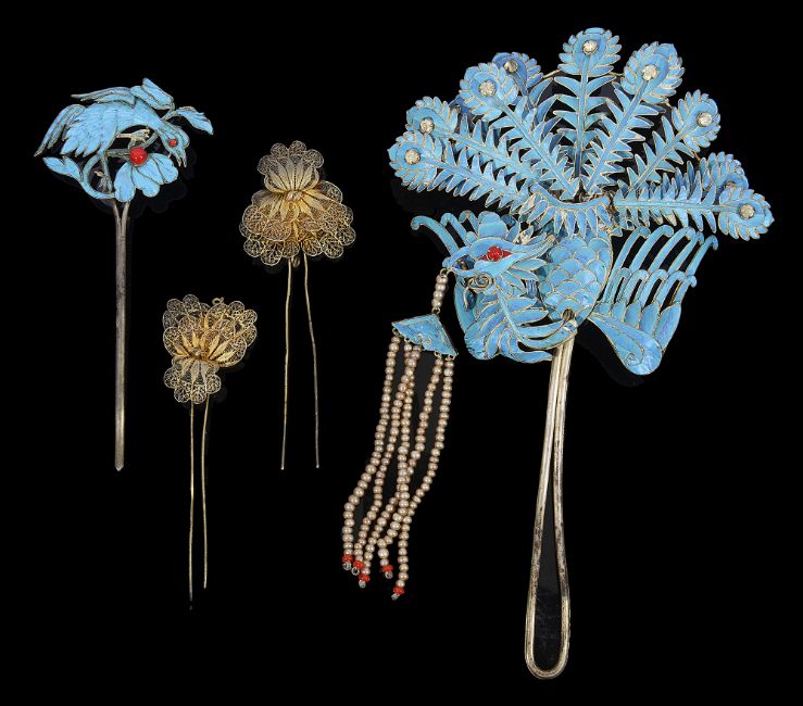 A large Chinese silver and kingfisher feather headpiece and other hair ornaments