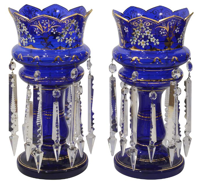 decorated with gilt and enamel flowers vase and garlands, suspending two tiers of six cut beads and prismatic drops, (2)