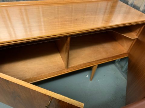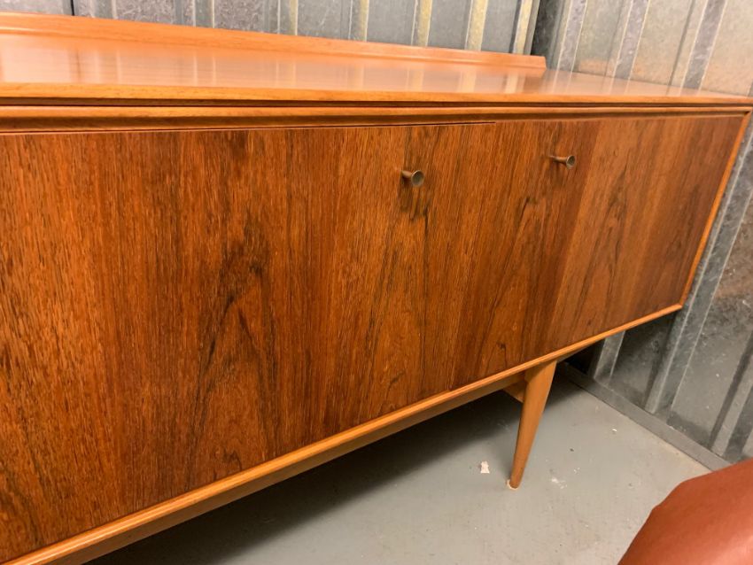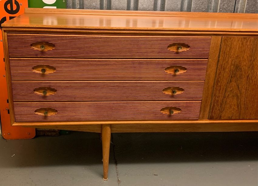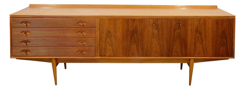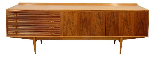 Robert Heritage for Archie Shine - A 'Hamilton' sideboard,designed 1957, in rosewood and teak, brass handles, ledge back, left side with four reeded front drawers, right side with two cupboard doors opening to reveal shelves, over tapering legs, dimensions approximately width 229cm, depth 50.5cm, height 78cm Condition: In overall good clean unrestored condition - some surface scratches and marks to top, surface scratches visible to legs.This lot  will be removed to our offsite storage facility if not collected at the sale venue – Farleigh Golf Club, Warlingham 3pm by Friday 16th Please contact us for more information.Please note: This lot is sold in compliance with CITES regulations and with (non-transferable) Transaction Specific Certificate No. 619462/02 For more information visit http://www.defra.gov.uk/ahvla-en/import-exports/cites
