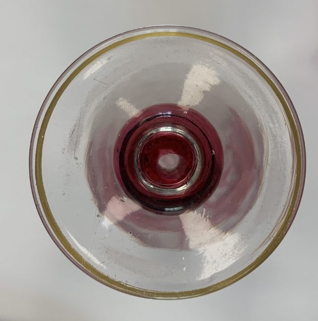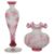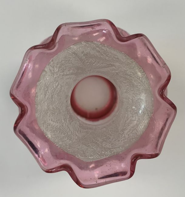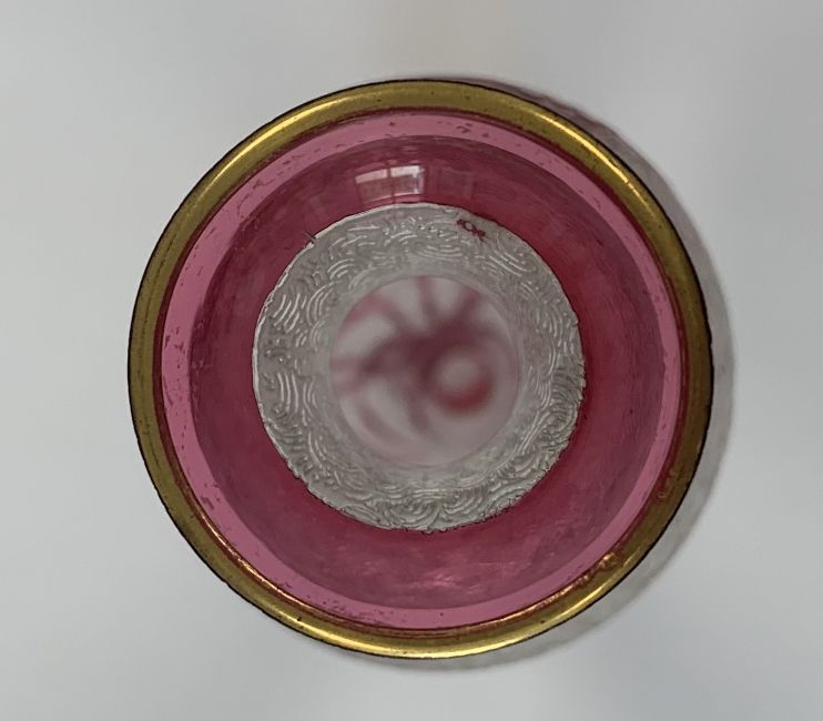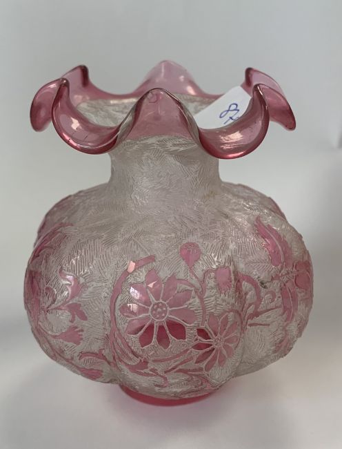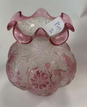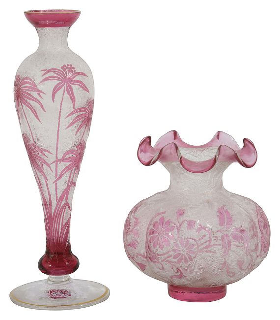 A small cameo glass vase, in the manner of Baccarat/ Val St Lambert, early 20th century, of lobed globular form with wavy rim, acid etched with textured fern motif body overlaid with cranberry glass floral motif, together with a similar design elongated baluster vase, acid etched with repeating circular motif, overlaid with pink glass in lily motif, gilt edged, (2)the first height 8.5cm, the second height 14.75cm Condition: The first - some minor flaws and scratches visible to rim, the foot with flaw to colour in vertical line.The second - wear to foot underside