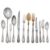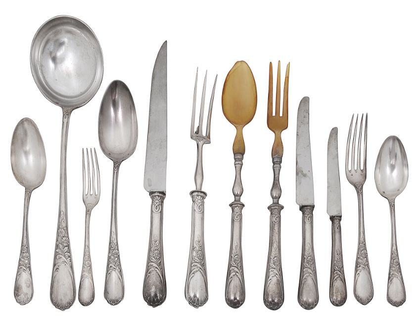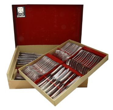 comprising twelve dinner forks, twelve table spoons, twelve dessert forks, twelve table spoons, twelve dinner and dessert knives with steel blades, a soup ladle, a basting spoon, a carving knife knife and fork and a pair of salad servers with horn spoon and fork, in a fitted case with lift out trays