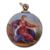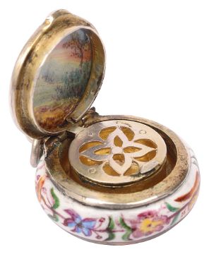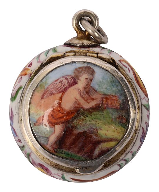 of circular form, painted with cupid and his quiver, the reverse with a figure in landscape, floral borders, the hinged cover opening to reveal a hinged pierced grille, with ring attachment