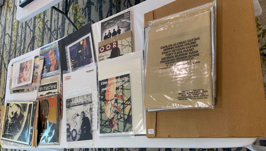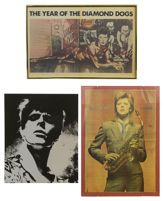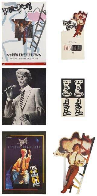 including; framed publicity poster; collection of clipped newspaper advertisements, magazines, publicity stills, modern calendars, a George Underwood 1984 Bowie poster, signed by Underwood in 2011; David Bowie Never Let Me Down album poster; a contemporary screen print; Tin Machine poster; four Bowie personality posters; Serious Moonlight record shop video standee, related poster poster plus two further video posters; reproduction Man Who Fell To Earth banner signed by George Underwood, 2011; Never Let Me Down promotional standee, framed promotional image, together with a David Bowie photographic image on glass overlaid with acrylic (qty)