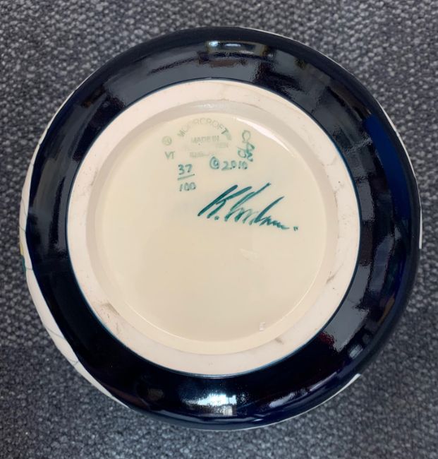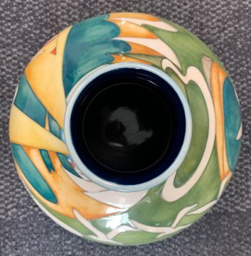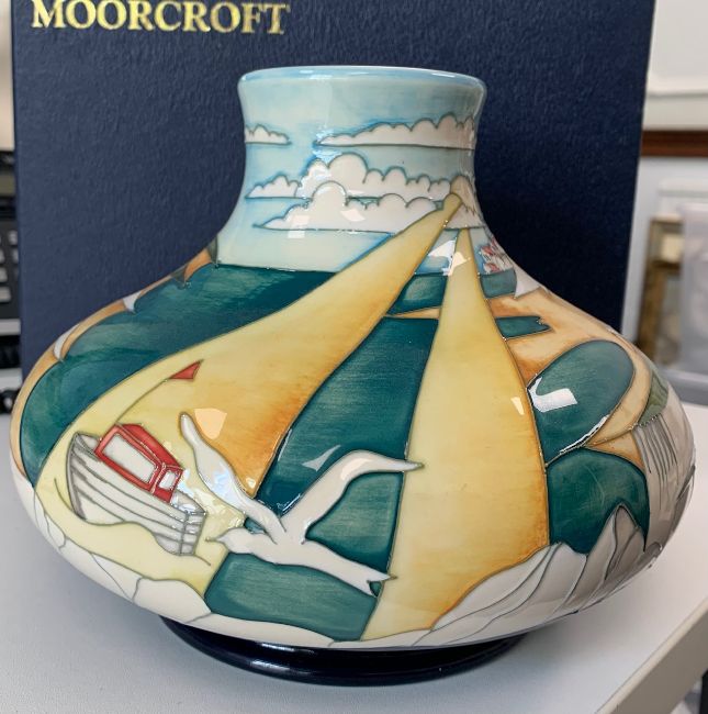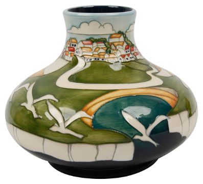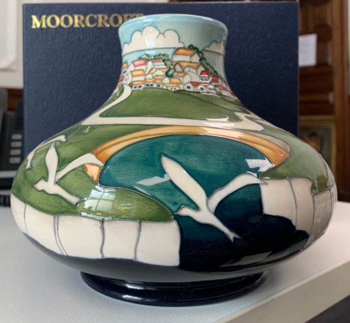 by Kerry Goodwin, dated 2010, of squat form, with tube lined coastal motif decoration, signed and numbered 37/100, impressed marks to base, with Moorcroft box,