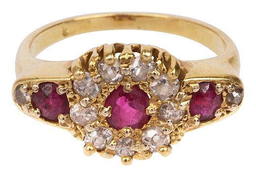 A ruby and diamond-set ring, the central ruby and old brilliant-cut cluster flanked to either side by an oval cut ruby and an old-cut diamondsize J1/2, 3.7gCondition: Overall condition good. Overall condition good. Possibly early 20th. Diamonds variously-cut, bright stones. Rubies bright with good hue and saturation, well matched.Shank possibly  sized.