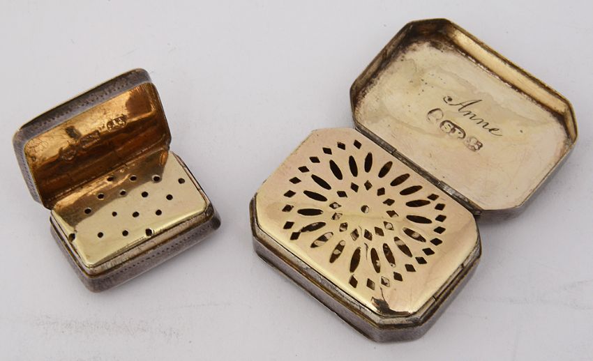 first Birmingham, 1813 by Samuel Pemberton, of curved rectangular form with canted corners, the hinged lid with bright cut border, interior gilt engraved 'Anne' with hinged pierce grille, second Birmingham, 1832 by Nathaniel Mills, the rectangular body with concave sides decorated with bright-cut engraving, slightly domed lid within engraved a central tablet within foliate borders, the gilt interior with hinged pierced grille, (2)