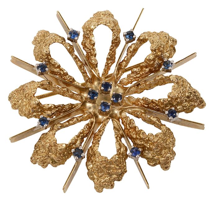 each petal separated by knife edged bar claw-set with a circular-cut sapphire and with four sapphire-set stamens to the centre,