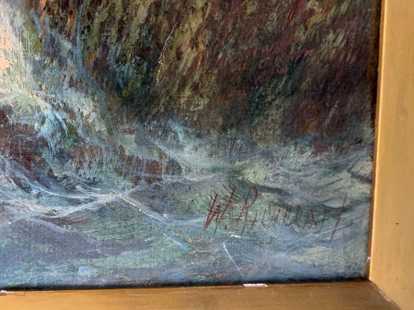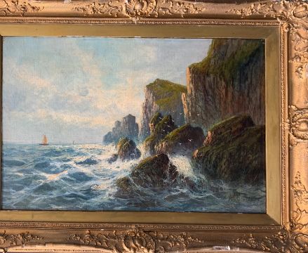 'Rocky Coastline with Fishing Boats', oil on canvas, signed lower right W. Richards, in gilt frame,