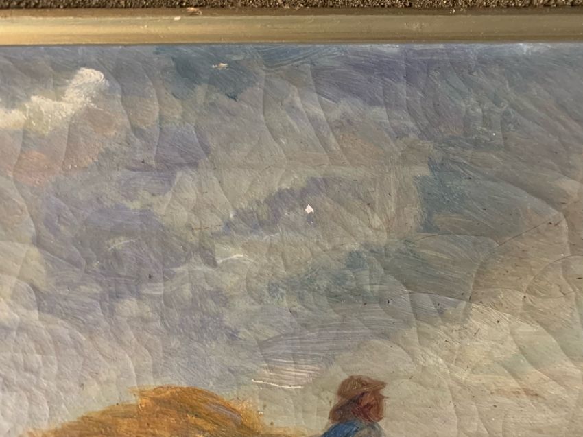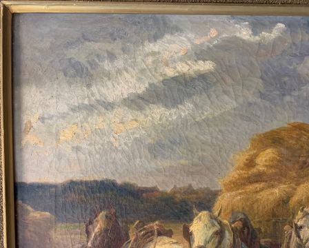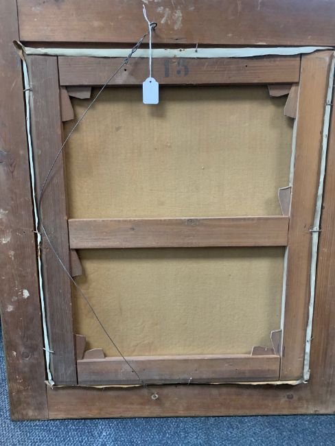 Condition: Picture would benefit from cleaning. Frame with chips and losses, craqueleur visible to entire canvas, small area of restoration visible to mid left edge within sky, small area of loss to surface right centre sky.