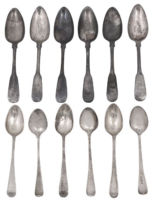 A set of six Scottish late George III silver teaspoons and a set six George III bright cut old English pattern teaspoons