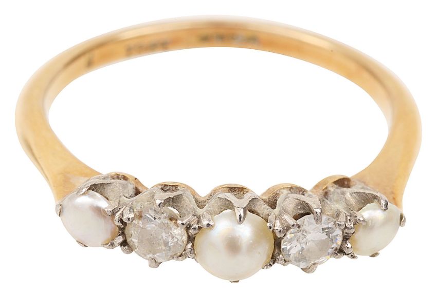 A pearl and diamond ringthe three graduated half pearls separated by a brilliant-cut diamond, the tapering shank stamped '18' Ring Size N/OCondition: Overall condition good. Pearls (untested) as per illustration.Diamonds PK , one with strong  fluorescence