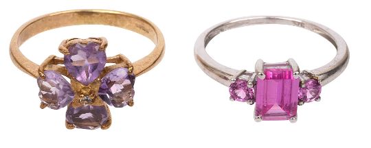 An amethyst ring, composed of four heart-shaped amethyst to a diamond-set centre, the 9ct yellow gold plain shank with Birmingham hallmark; together with a pink sapphire (untested but probably synthetic), the 9ct white gold shank with convention hallmark (2)