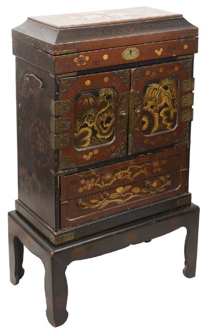 A Japanese Meiji period gilt decorated lacquer kodansu or table cabinet on stand