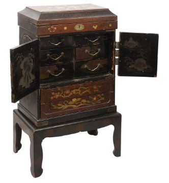 Condition: Hinges replaced on lid. Chips, losses and wear to lacquer mainly on edges. Pins have moved on some of the hinged of doors. Some divisions absent from slope.