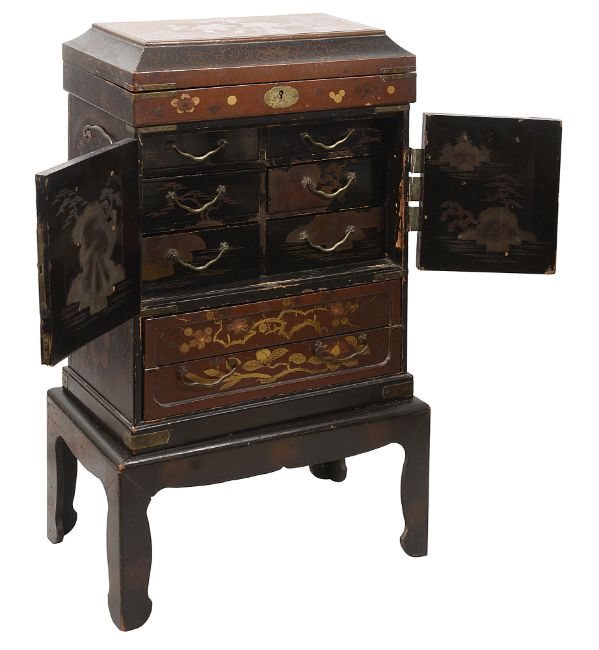 the hinged domed top enclosing a fitted with divisions and lids, over a pair of doors decorated with pine trees, a pheasant and a Mount Fuji, enclosing six drawers, over a pull out folding writing slope with a drawer to one side