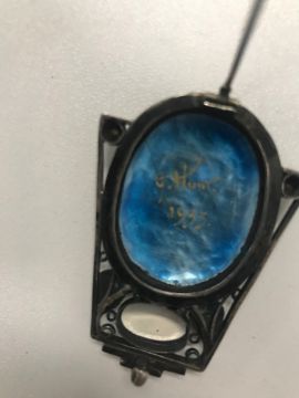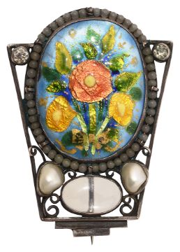the central oval concave polychrome enamelled plaque depicting Iceland poppies (papaver nudicaule) within an openwork silver frame set with an oval moonstone, two blister pearls and two colourless paste collets, the reverse singed 'G. HUNT/1933'