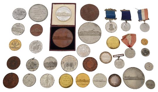 to include a cased bronze medal by Pinches for the opening 1854, a silvered example of the same medal, a silvered medal by Wyon, bust of Paxton left for the opening 1854, a silvered medal by Dowler, for the 1862 Exhibition, two bronze medals by Pinches for the Visit of the the band of the Imperial Regiment of Guides 1854, a bronze medal by Desaide Roquelay for The Universal Society For The Encouragement of Arts and Industry, 1856 awarded to Messrs Elkington Mason & Co., a silvered medal for the Great International Exhibition 1856 by Pinches, a cased silvered medal by Pinches for the opening 1864 in brass case of issue, International Velocipede & Loco-Machine Exhibition 1869 gilt medal by W. J. Taylor, The People's Palace London - Apprentices 1887 Exhibition copper medal by J.A. Restall, The National Co-operative Festival Home Industries i-Crystal Palace copper medal, a London & Provincial Ornithological Society silver prize medal 1862 (unnamed), another silver prize medal (unnamed), the Naval & Military Exhibition, 1901 gilt medal, various silvered medals and tokens, attendance medals on ribbons, etc., (qty)